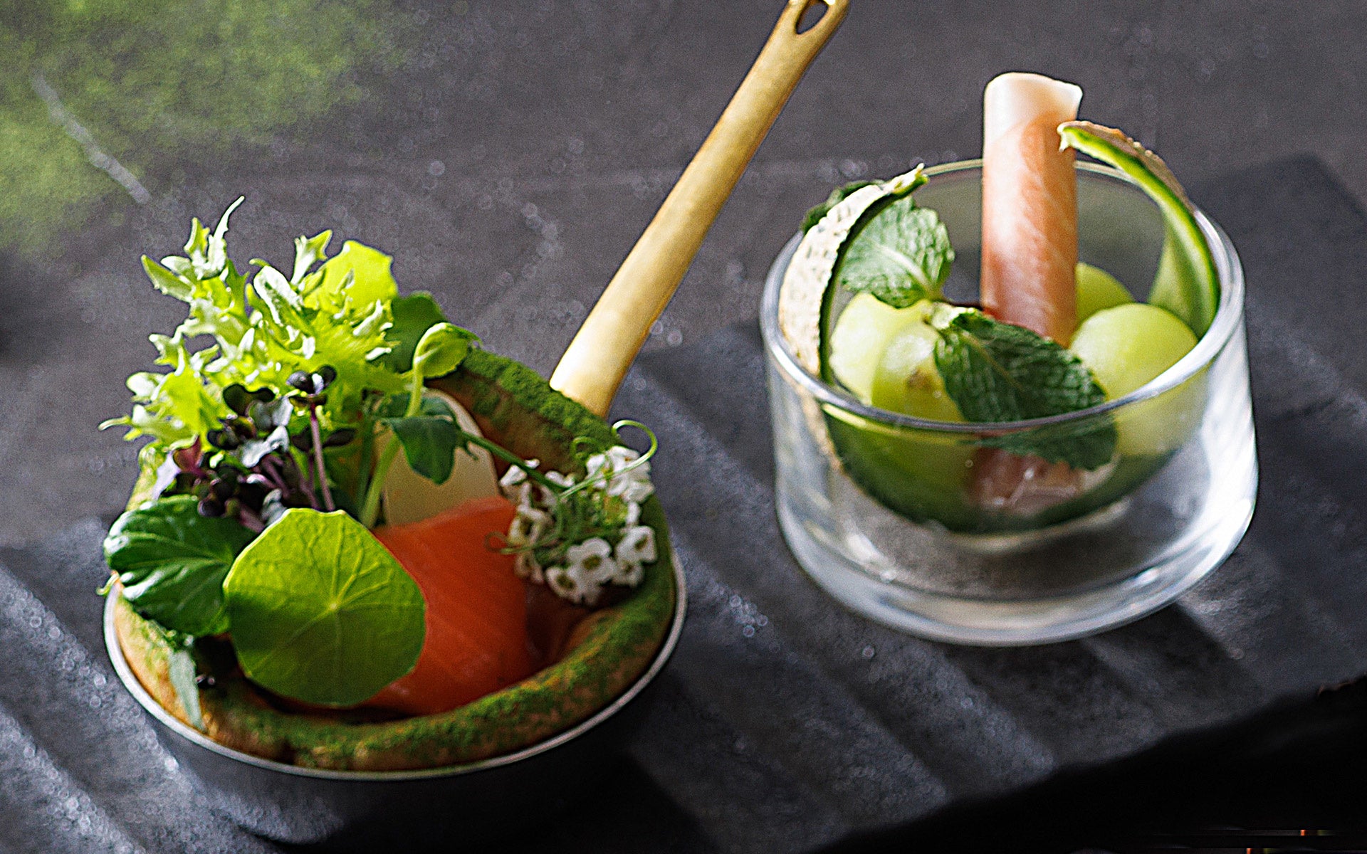 浅草ビューホテル所有の「美盆」を舞台に、浅緑色の庭園を創り、抹茶の芽ぐみのスイーツと初夏のメロンを盛りました。