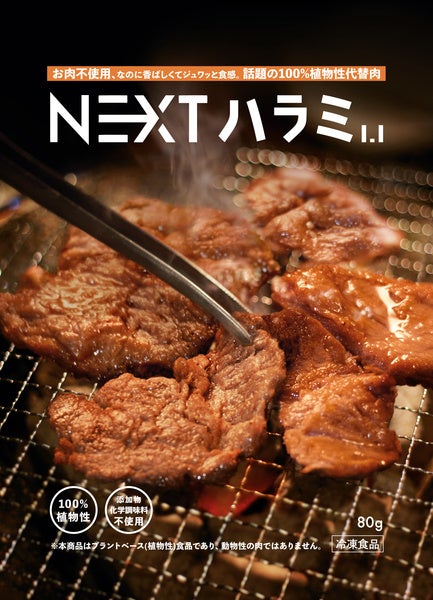 世界初の焼肉用代替肉(植物肉)「NEXT焼肉」シリーズより、ジュワッと柔らかい「ハラミ風」。3年にも及ぶ開発を経て商品化に成功した、次世代のお肉として話題です。一般的な牛焼肉と比べると脂質が半分以下で、タンパク質は約2倍、無添加かつ国産大豆100%の大豆ミート。