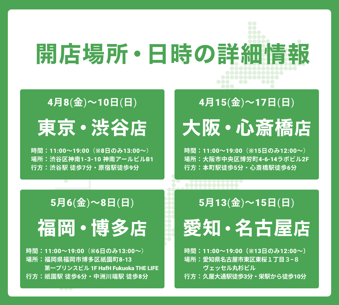 4月、5月を通して日本全国4カ所(渋谷・心斎橋・博多・名古屋)各地3日間にて期間限定オープンしてまいりました。今回は三井不動産株式会社、株式会社Gabの共同企画「ETHICAL BASE」への出店になります。