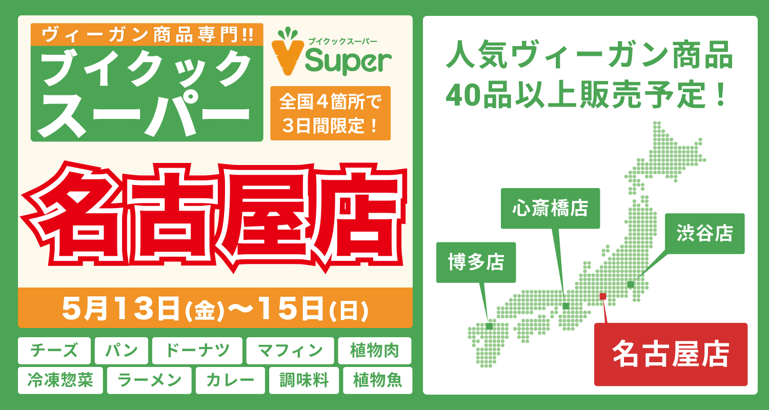 株式会社ブイクック(本社:兵庫県神戸市、代表取締役:工藤柊)は、2022年5月13日(金)〜5月15日(日)、名古屋にて3日間限定のヴィーガン商品専門「ブイクックスーパー」を開店いたします。