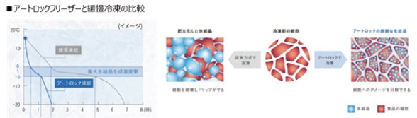 急速冷凍に凍結媒体ごとの特殊な技術を踏襲することで、さらに高品質な冷凍を実現する技術です。一般的な冷凍の場合、細胞内の水分が氷に変わる温度帯(氷結晶生成温度帯:0℃~-5℃)の通過時に、 氷結晶が大きく歪になることで細胞が損傷。一方急速冷凍は、急速かつ均一に冷却することで氷結晶が小さく生成され、細胞の損傷を極少化でき、うまみ成分の流出を防ぎます。さらに特殊冷凍では、冷風の湿度や冷風の当て方などの特殊技術が加わり、形状維持や調理済みのあたたかい食品の急速冷凍を実現。これまで困難とされていた食材の急速冷凍を可能にするとともに、従来を上回る高品質な冷凍食材を生み出します。