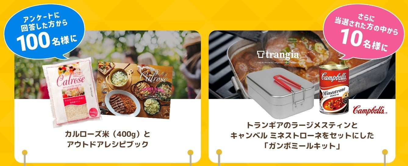 下記「アウトドア カルローズレシピ」のページから簡単なアンケートにお答えいただいた方を対象に、抽選で100名様にカルローズ米400gとアウトドアレシピブックをプレゼント、さらに、その内10名様に今人気のアウトドア調理グッズ、トランギアの「ラージメスティン」と、アメリカ南部の郷土料理「ガンボスープ」を作れる、「キャンベル濃縮缶スープ ミネストローネ」をセットにしてプレゼントいたします。