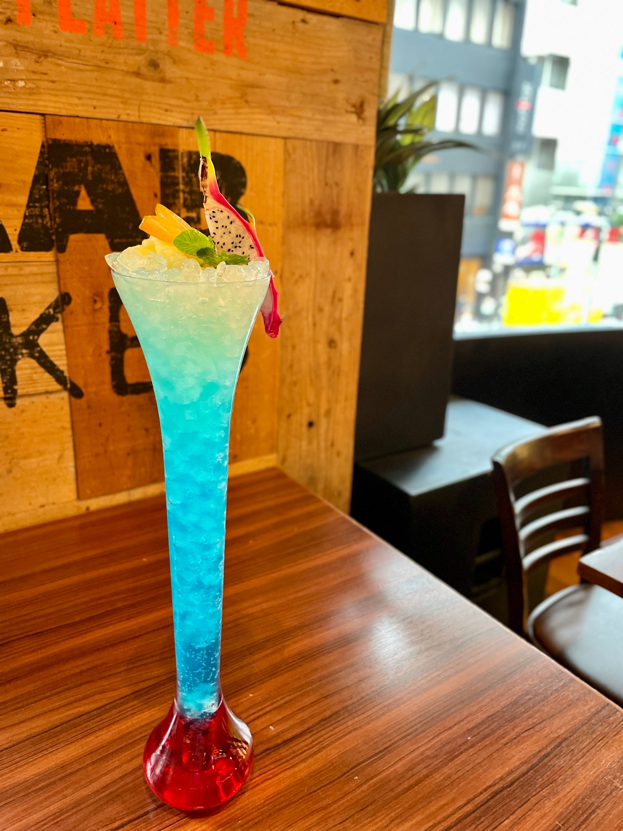 アルバムタイトルの「SO FAR SO GOOD」にちなんだウォッカ、コアントロー、レモネードを合わせた、飲み口はさっぱりしているけれど刺激が強めのカクテル。日替わりのトロピカルフルーツで彩ったハーフヤードスタイルで。
