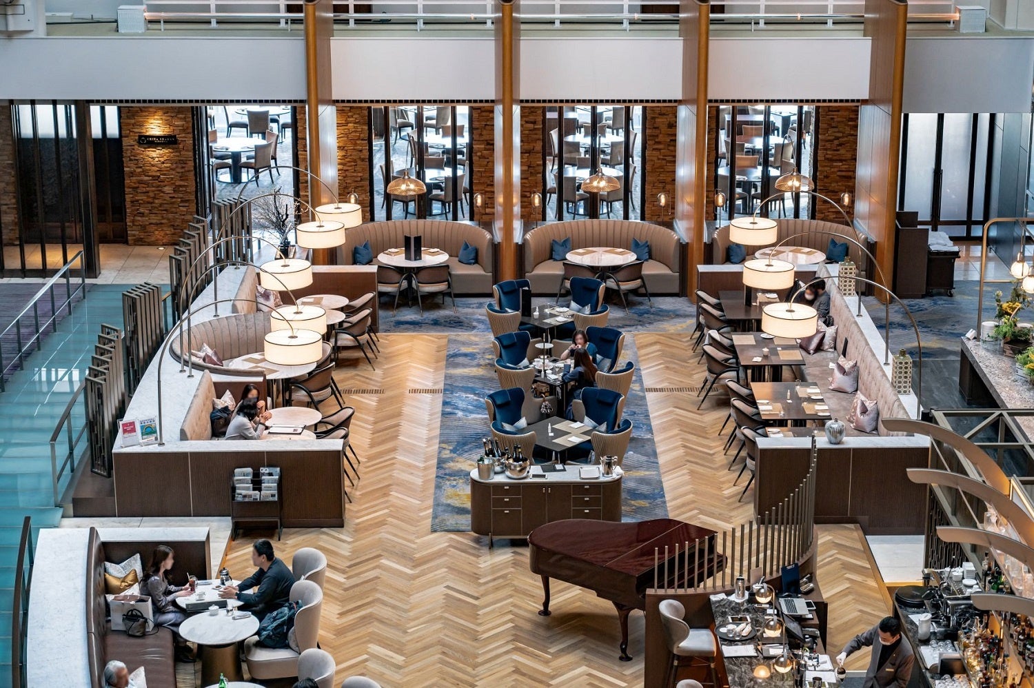 イタリアングリル「メロディア」は、音楽の要素である“メロディ”をイメージした温かみのあるデザインで、しつらえには音符や五線紙などがいたるところに散りばめられています。6層分の吹き抜けの開放的なアトリウムは、朝は爽やかな陽射しが差し込み、夜はキャンドルライトがきらめく心地よい空間に。長さ26メートルのガラスブリッジが美しく光を反射します。ブレックファストからランチ、ディナーと旬の食材を最大限に活かしたアートのようなプレゼンテーションで優雅な時間を演出します。