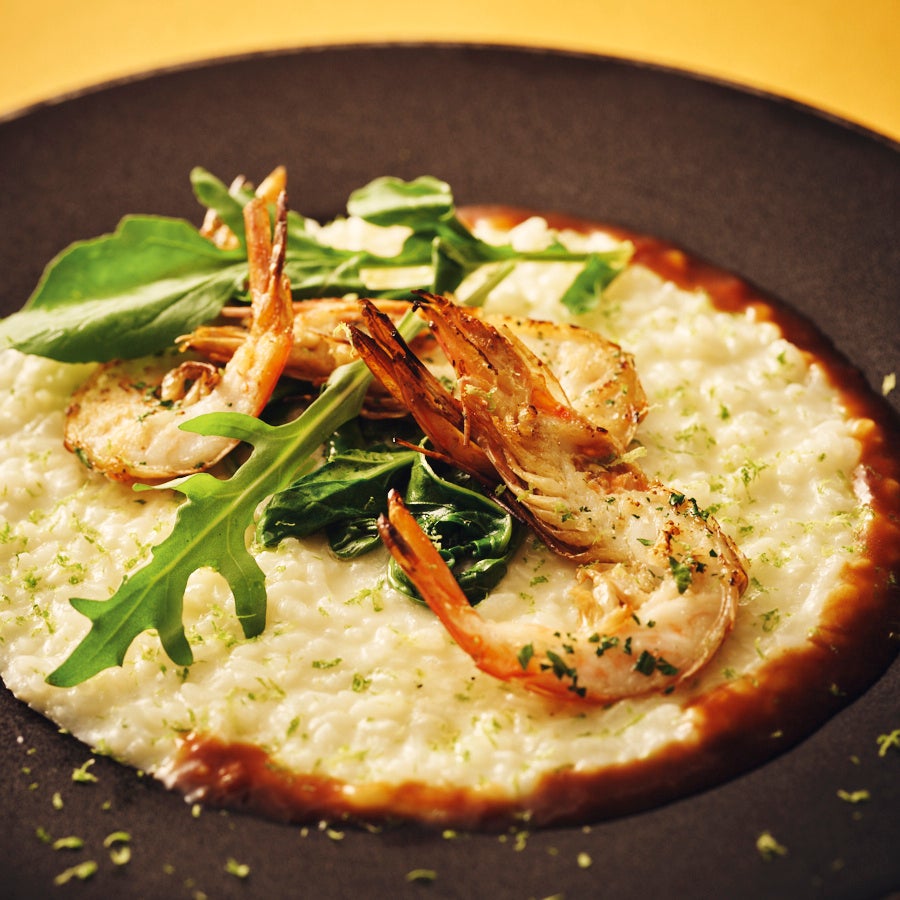 - 新潟県産 ‘和み’ リゾット ライムの香り 海老のソテー&ルッコラ