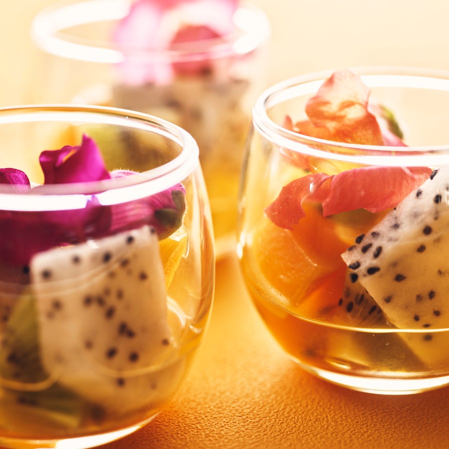 整腸効果を高めるといわれるアロエは、言わずと知れたトマトのリコピン同様、抗酸化作用があり美肌効果が期待できます。くちどけなめらかなパンナコッタをカラフルに可憐に仕上げました。