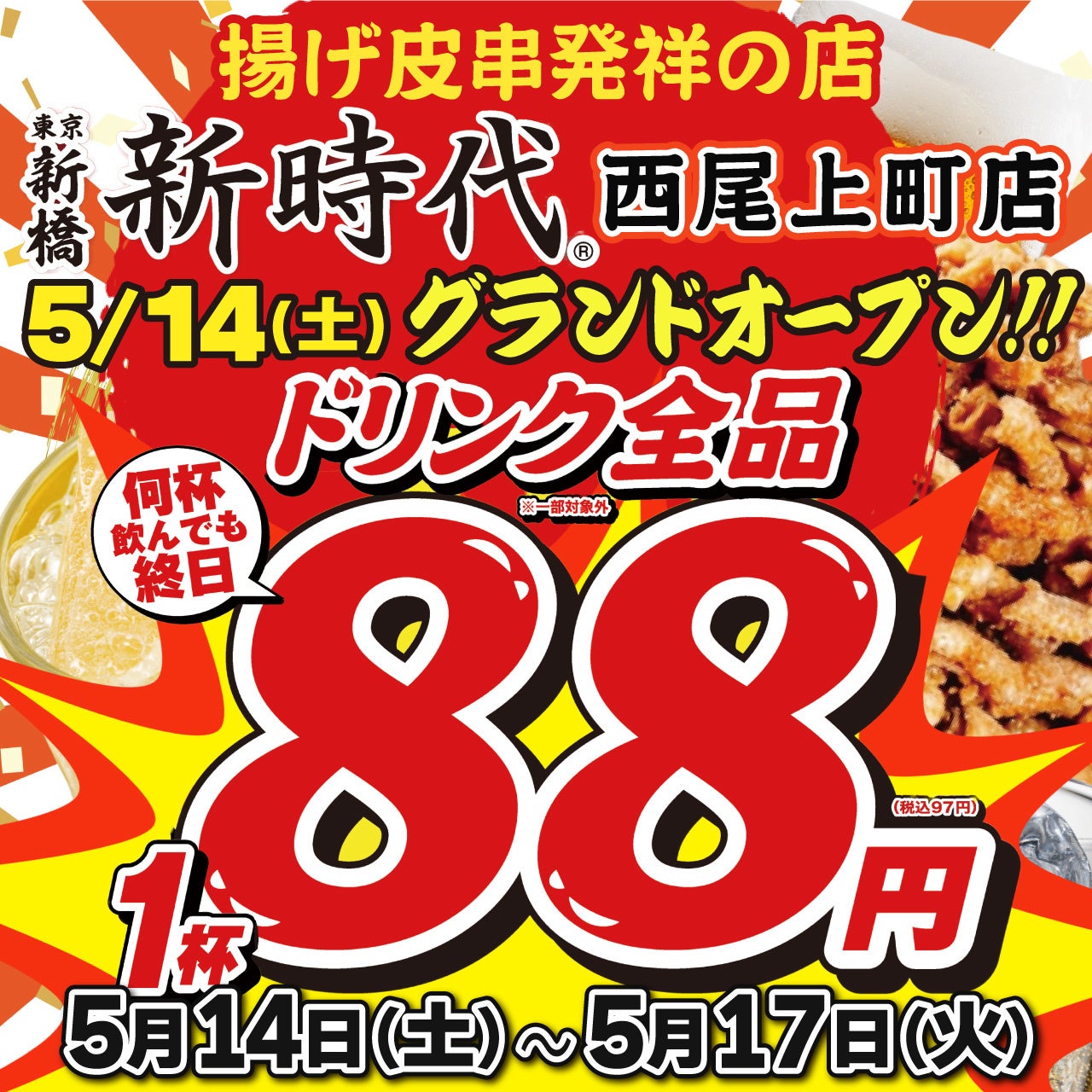 「新時代 西尾上町店」のオープンを記念し、ドリンク全品を1杯88円(税込97円)でお楽しみ頂けるキャンペーンを開催します。一度、『新時代』にご来店頂ければ、新時代がなぜこんなにも人気なのかを分かって頂けると思います。皆様のご来店お待ち申し上げます。