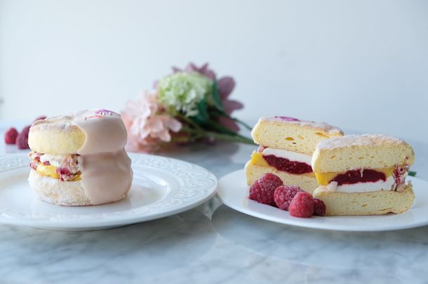 丁寧に焼き上げるふわふわパンケーキで、酸味の効いたラズベリーのジュレとライチ生クリーム、ふわりと香るバラのカスタードを挟んだ大人リッチな味わい。