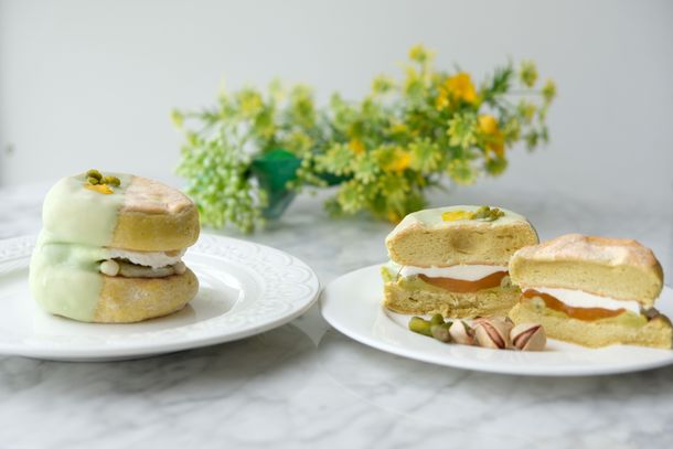 ホワイトチョコで作るピスタチオガナッシュ、アプリコットの酸味を活かして作るジュレを組み合わせ、甘い香りが特徴的なトンカ豆を漬け込み作る生クリームをパンケーキで閉じ込めます。