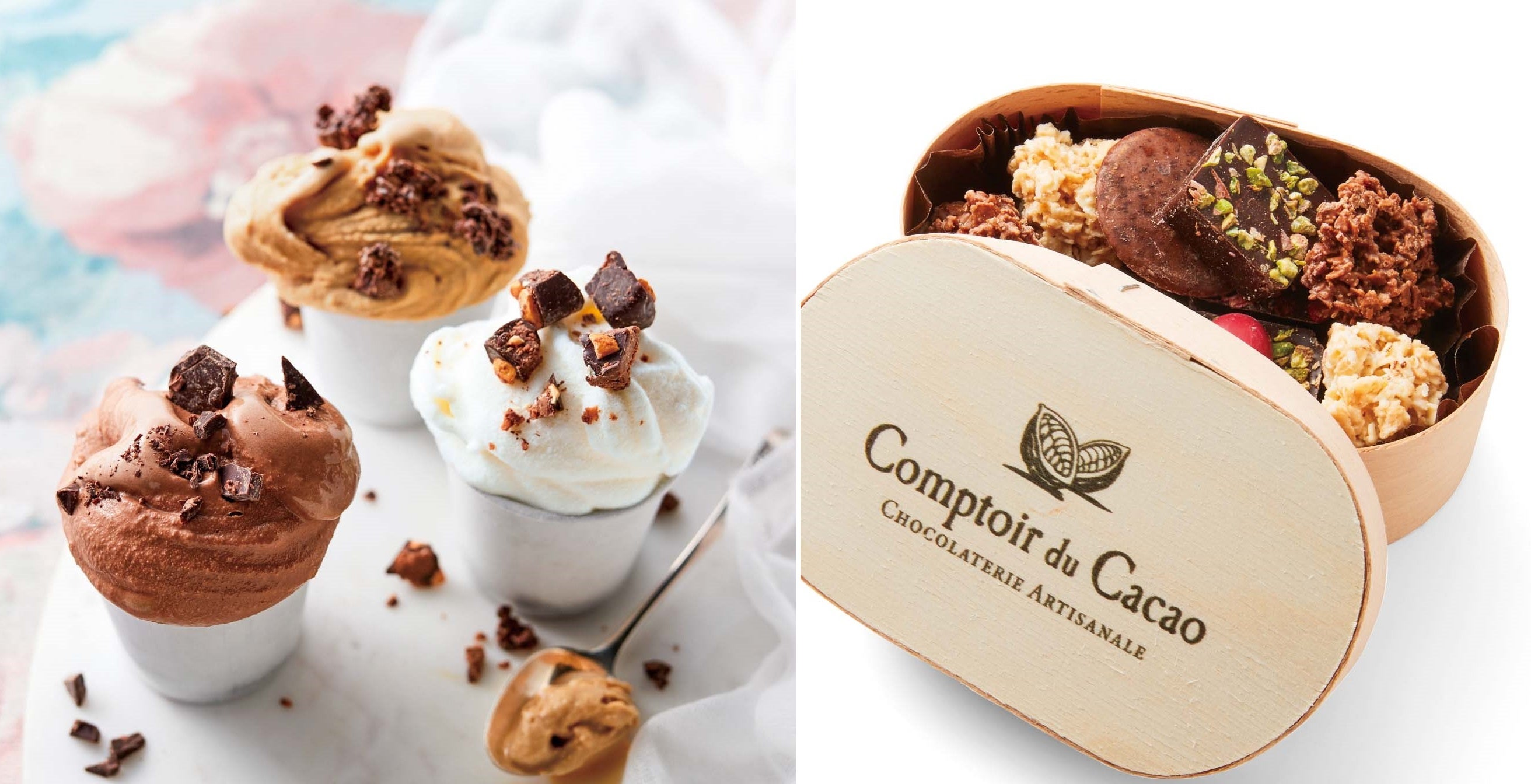 チョコがぎっしり詰まったパリの有名店「コントワ ドゥ カカオ」アソートボックスから3種類のチョコをピックアップして、それぞれのチョコに合うチョコアイスを日本のジェラート職人が考えた世界でここだけのアイスです。さまざまなチョコが味わえる楽しさをアイスでもお届けしたい!と、3種のチョコアイスにそれぞれ違うチョコをトッピングしました。8月はミルキーなホワイトチョコアイスにヘーゼルナッツプラリネチョコを、9月はミルクチョコアイスにほろほろ砕けるクロスティンをオン。10月はダークチョコアイスで、カカオニブとダークチョコの深みが際立つ逸品に。そのままはもちろん、アレンジすればさらに楽しい贅沢(ぜいたく)アイスに。心ゆくまで至福の味を堪能できる逸品です。