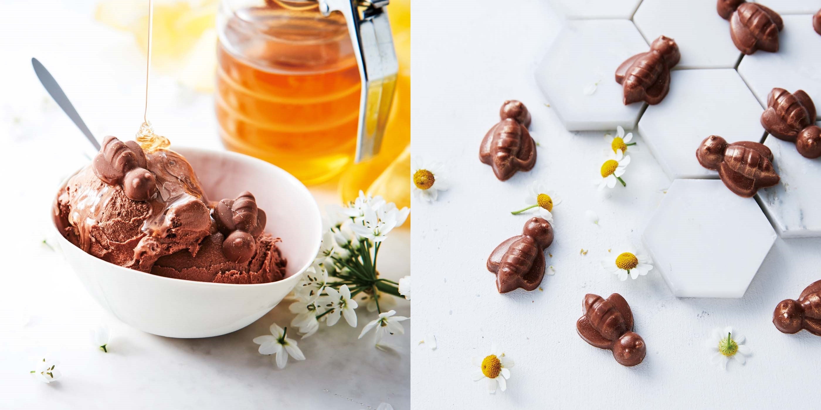 口溶けのよいダークチョコアイスに、養蜂天国スロベニアの上質のはちみつをたっぷり使ったはちの形のミルクチョコをそのまま大胆にトッピングしています。一緒に食べると、はちみつの香りと風味がぶわーっと広がって一瞬ではちみつチョコアイスのとりこに。さらにセットのアイスに合う国産苔提樹(ぼだいじゅ)のはちみつをかけて味わうと、しあわせの余韻がずっと続きます。“これでもか!”というくらいのはちみつ感に、ノックアウトされるはずです。