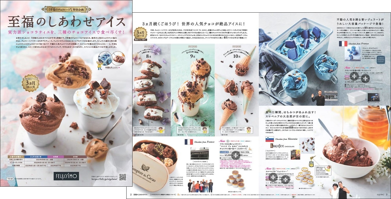 フェリシモが展開する、海外レアチョコレートを販売する専門サイト・カタログ『幸福(しあわせ)のチョコレート』は、夏の特別企画として、世界のあのチョコレートがアイスになった「至福のしあわせアイス」のウェブ予約を4月15日より行っています。1.【3ヵ月お届け便】はミシュランも認める実力派ショコラティエのチョコをアイスで食べ比べ。2.食べた瞬間はちみつがあふれ出すスロベニアの“リュシファー” チョコアイスとはちみつのセット。3.フランスの幸福の青いチョコレート“ケルノン ダルドワーズ”ジェラートが大容量のパッケージで登場と、まさに至福のしあわせアイスラインナップです。【3ヵ月お届け便】と、【8月便】・【9月便】があります。詳細は、デジタルカタログや特設サイトでチェックできます。予約申し込みは【3ヵ月お届け便】・【8月便】は6月15日まで、【9月便】は7月13日までです。