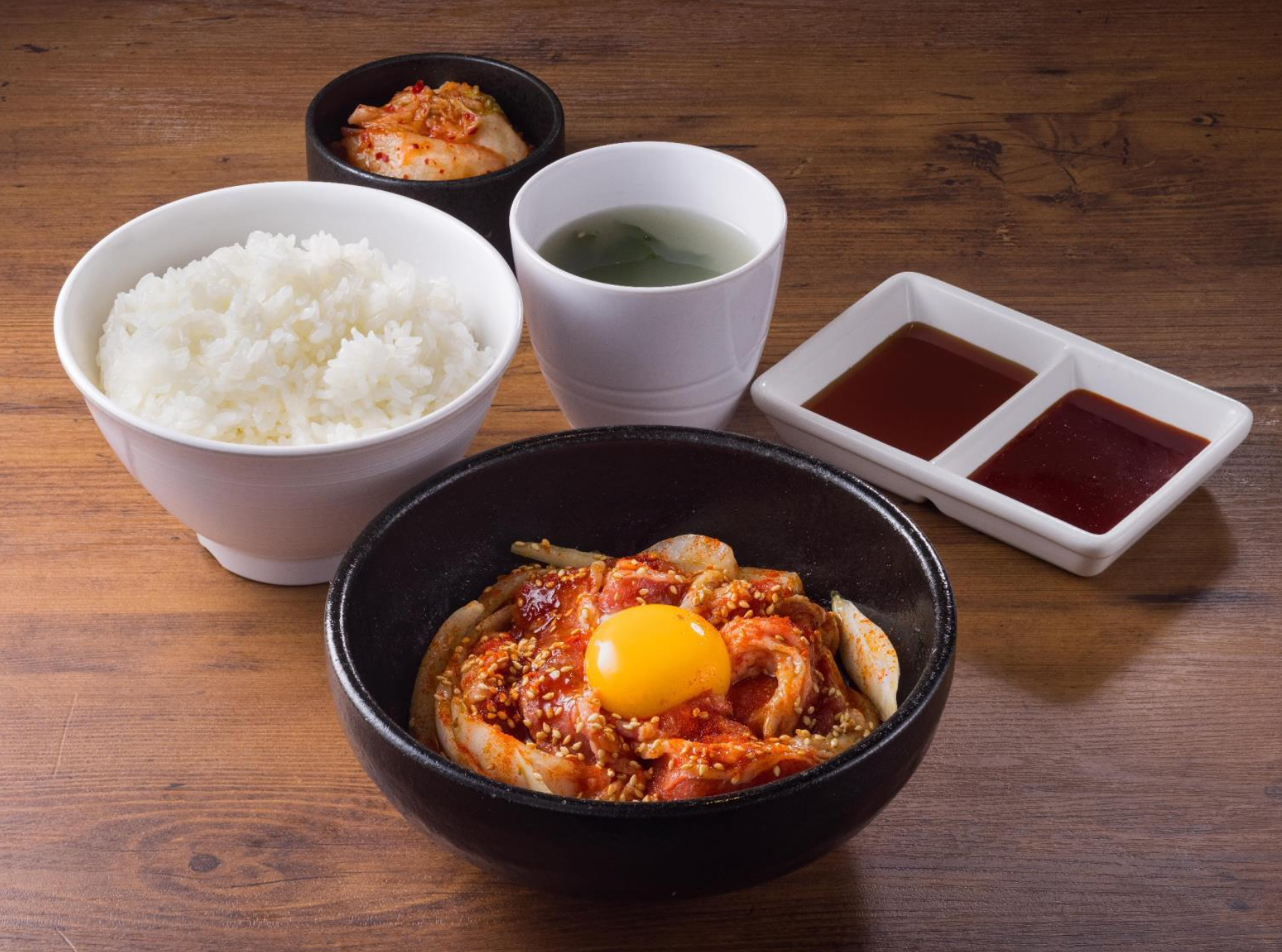 卓上のコチュジャンダレで辛味を調節したり、セットについているキムチを加えたり、自分好みにカスタムが可能です。