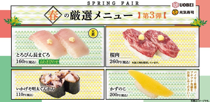 寿司レストランチェーンを展開する元気寿司株式会社(本社:栃木県宇都宮市 代表取締役社長 法師人尚史)は、2022年5月26日(木)までの期間限定で「厳選本鮪赤身」や「山形牛」をはじめとする『地中海産本鮪と国産極みネタづくし』フェアを開催いたしております。また、現在大好評開催中の『春の厳選メニュー』フェアの第3弾として、脂が乗った天然の厳選された「とろびん長まぐろ」など計4品を5月17日(火)から販売開始いたします。