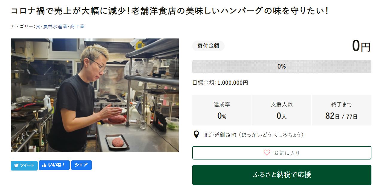 北海道釧路町(町長:小松 茂、以下「釧路町」)と、国内最大級のふるさと納税総合サイト「ふるさとチョイス」( https://www.furusato-tax.jp/ )を企画・運営する、株式会社トラストバンク(本社:東京都渋谷区、代表取締役:川村憲一、以下「トラストバンク」)は、本日5月16日、コロナ禍で売り上げが大幅に減少した老舗洋食店ネーベン・フルス(釧路町別保)が名物であるハンバーグを返礼品として新たにふるさと納税制度に参画することを目指して、設備投資等の資金となる寄付金を募るプロジェクトを開始します。ふるさと納税制度を通じてクラウドファンディング型で寄付を募る仕組み「ガバメントクラウドファンディング®」(以下「GCF®」)での募集となります。