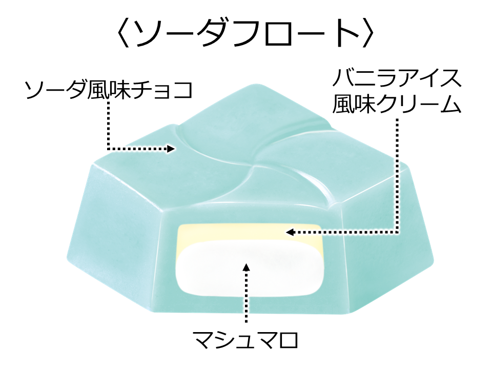 バニラアイス風味クリームとマシュマロをソーダチョコで包みました。どこか懐かしい味わいです。