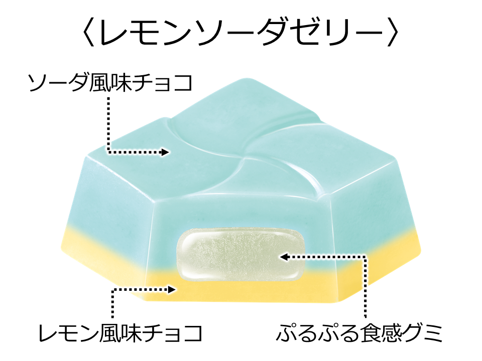 ゼリーをイメージしたぷるぷる食感のグミを、レモンチョコとソーダチョコで包みました。レモンの爽やかな酸味がソーダと相性抜群です。