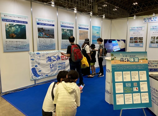 会場内中央のブースでは、海洋プラスチックごみの現状や問題の深刻さなどをパネル展示した他、「LOVE OUR BAY! 海ごみゼロ! プロジェクト」の活動内容に関してのパネルや映像、そして今期設置予定のごみ拾い専用回収BOX「拾い箱」の展示を行い、合わせて海洋ごみについての知識や理解を深めるために「海ごみ検定」も実施しました。海ごみ検定はスマホから海洋ごみに関しての設問をクイズ形式で10問答えるもので、ブース内のパネルをヒントに回答を考えながら参加してもらい、参加者には千葉県公式キャラクター「チーバくん」と本プロジェクトのコラボステッカーをプレゼント。3日間で約1,500人が「海ごみ検定」に参加しました。参加者は、初めて知る海洋ごみの状況や深刻さに驚く人も多く、パネルの写真や内容を時間をかけて見る様子が印象的でした。