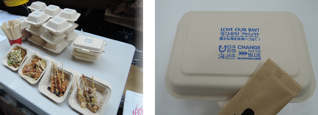 13万人以上が来場した会場内で「LOVE OUR BAYフードコート」を展開しました。10台のキッチンカーが並ぶフードエリアでは、全店舗がプラスチックを使用しないエコ素材(サトウキビの搾りかすと竹が原料)の容器を使用し、この容器にも「海と日本プロジェクト・CHANGE FOR THE BLUE」と本プロジェクトのロゴを入れて料理を提供しました。約4万食分のプラスチック容器の削減と合わせて、何故プラスチックを削減しなければならないのかを考えてもらうきっかけ作りになったことと思います。