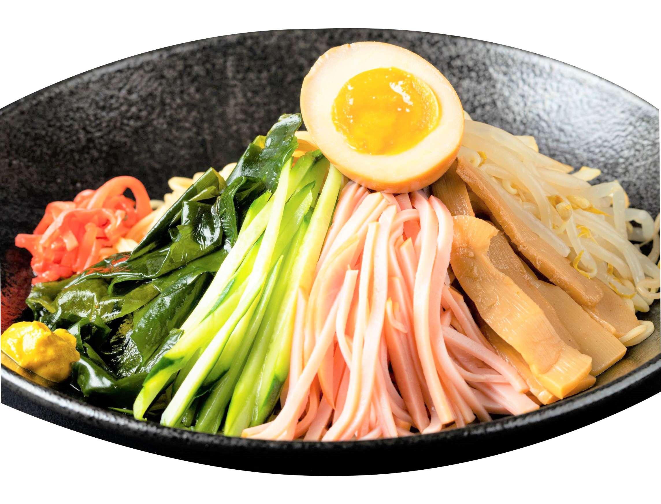 トッピングに定番のきゅうりやロースハム、人気の煮玉子にヘルシーなワカメ、歯ごたえのあるメンマを盛り付け、色鮮やかでさっぱりとした味わいです。