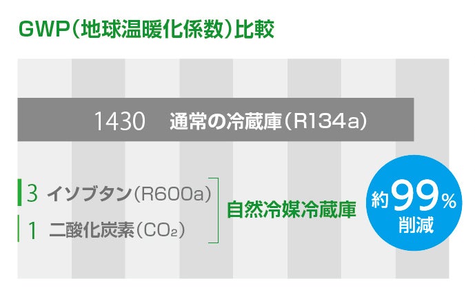 本製品は、地球環境に影響を及ぼす特定フロンや代替フロンに代えて自然冷媒を用いることで、従来製品に比べ地球温暖化係数(GWP)を約99%※3削減しました。