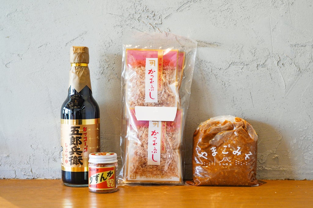 調味料:井伊商店 麦みそ、三五八漬けのもと、一休寺納豆、能登のポン酢