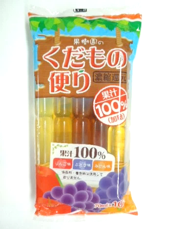 商品特徴:着色料、保存料を使用していない果汁100%の棒ジュースです。りんご、ぶどう、みかん味。
