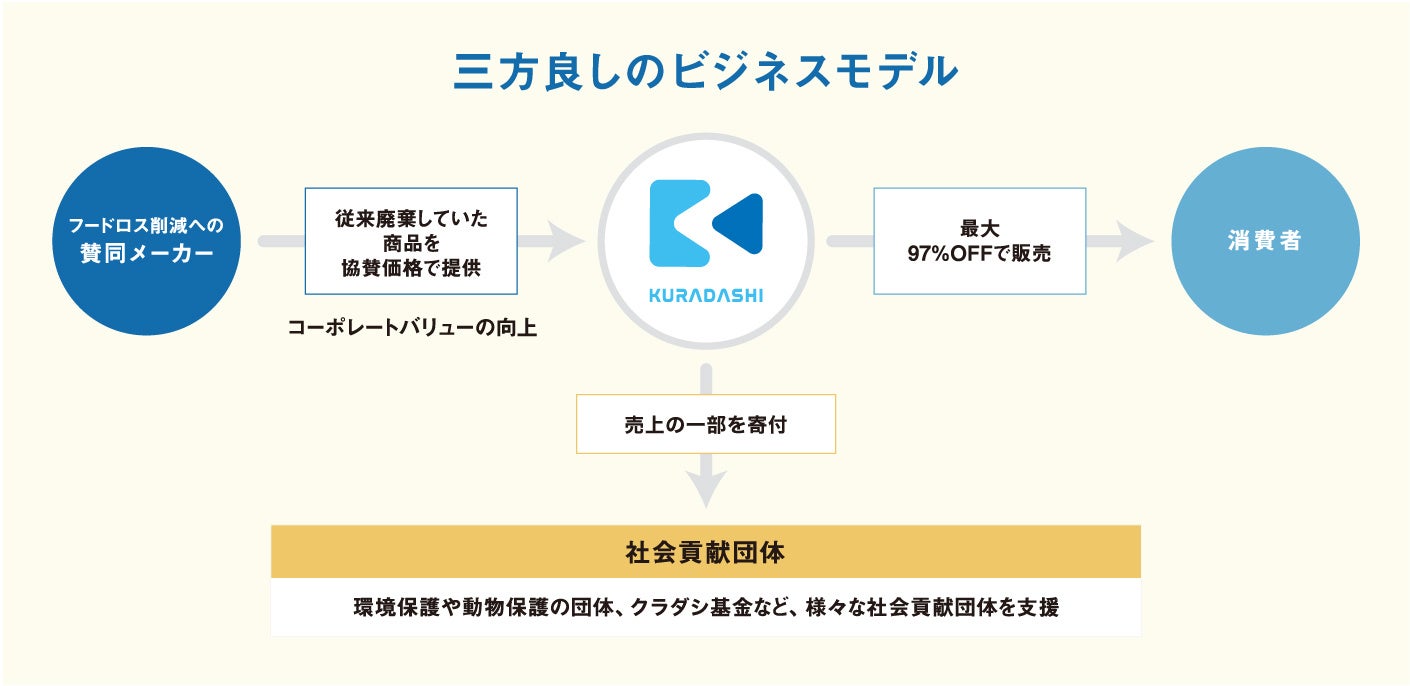 クラダシは、「日本で最もフードロスを削減する会社」をビジョンに掲げ、食品の賞味期限の切迫や季節商品、パッケージの汚れやキズ、自然災害による被害などの要因で、消費可能でありながら通常の流通ルートでの販売が困難な商品を買い取り、社会貢献型ショッピングサイト「KURADASHI」で販売することでフードロスの削減に取り組んでいます。また、売上の一部を環境保護や動物保護、医療支援などを行う社会貢献活動団体に寄付しています。