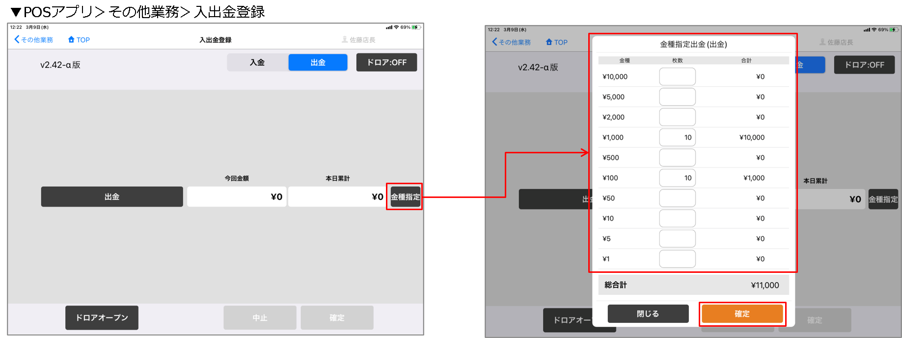 自動釣銭機連携時の出金機能で金種を指定して出金できるようになりました。両替時や硬貨がFull状態になった際に釣銭機本体を直接操作しなくても対応できます。