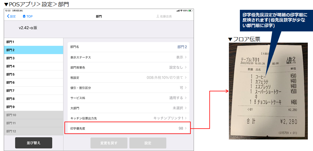 フロア伝票にも明細の印字順番の優先度設定が反映されるようになりました。