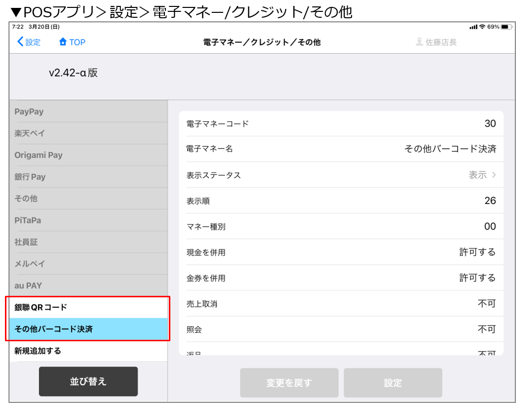 電子マネーマスタに「銀聯QRコード」「その他バーコード決済」を追加しました。それぞれ表示設定に切り替えることで会計画面で使用できます(バーコード支払の売上区分で集計されます)。