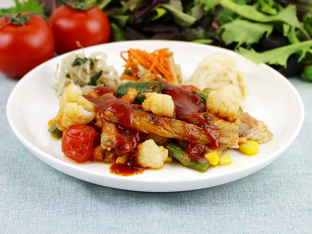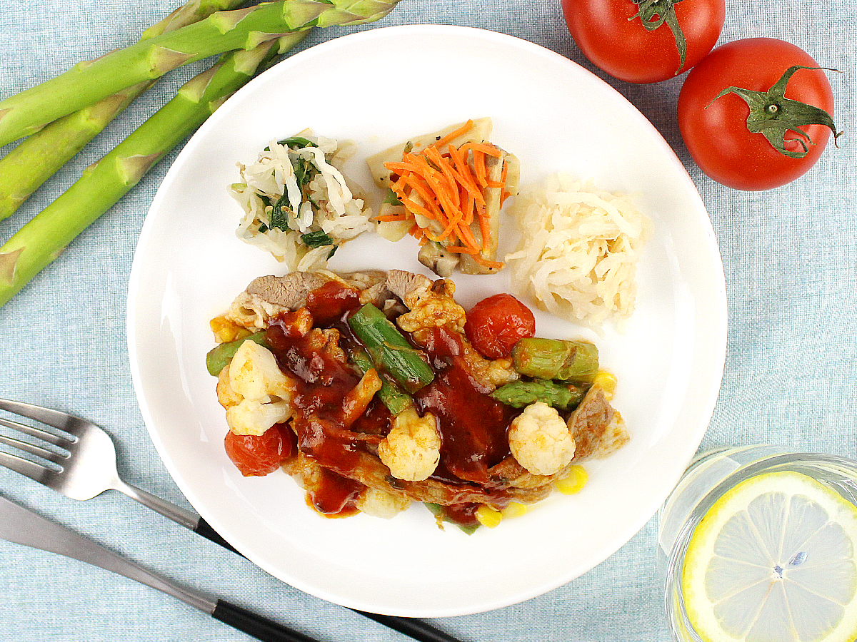 蕃茄牛肉(ファンチェニュウロウ)をイメージしたこのプレートは、牛肉とコーン、アスパラ、ミニトマト、カリフラワーを彩りよく盛り込みました。見た目にも楽しい1品となっております。トマトソースをベースにオイスターソース、ナンプラー、バジルなど様々な風味をプラスしました。