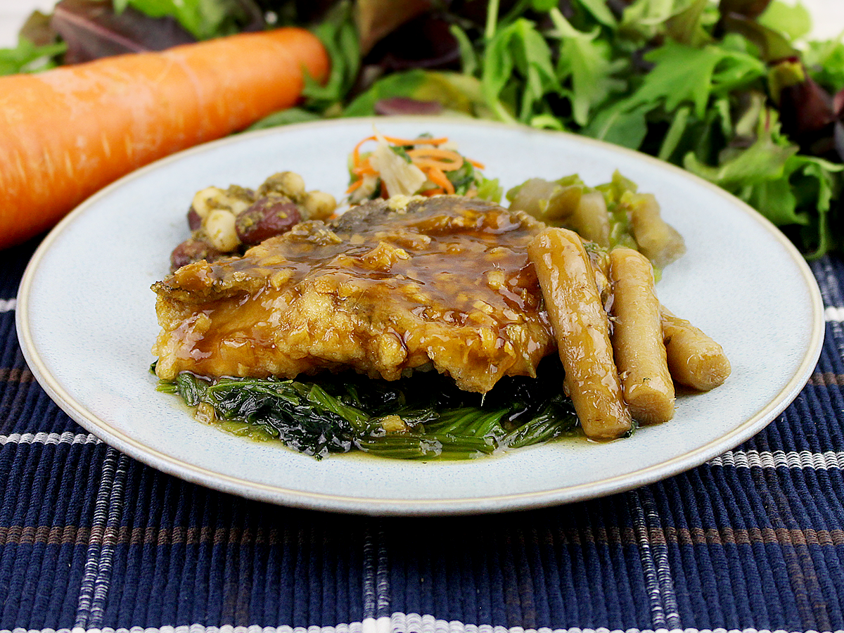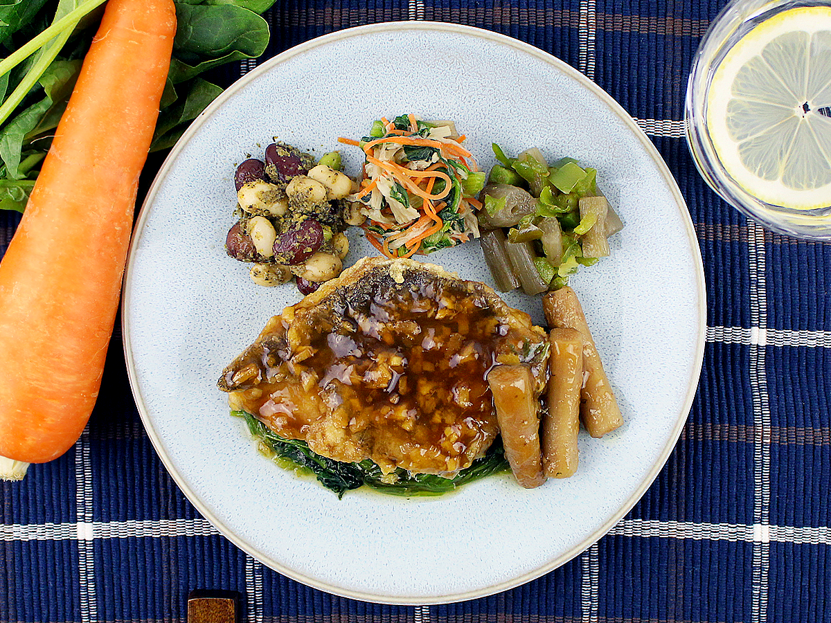 カラッと揚げたほっけの生姜煮をご用意しました。たれはナッシュ特製のお出汁の効いた甘い醤油にきざみ生姜をふんだんに使用しております。生姜に含まれる「ショウガオール」には、体を芯から温める効能があります。添え野菜のほうれん草、歯ごたえのあるごぼうと一緒にお召し上がりください。