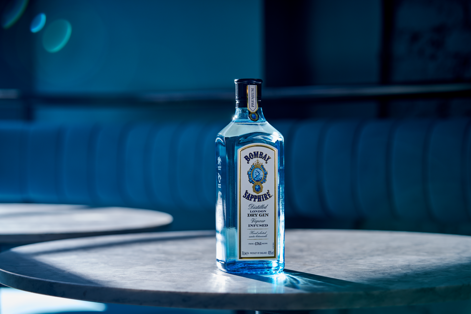 ・ボンベイ・ドライまたはボンベイ・サファイアのボトルが写っている。