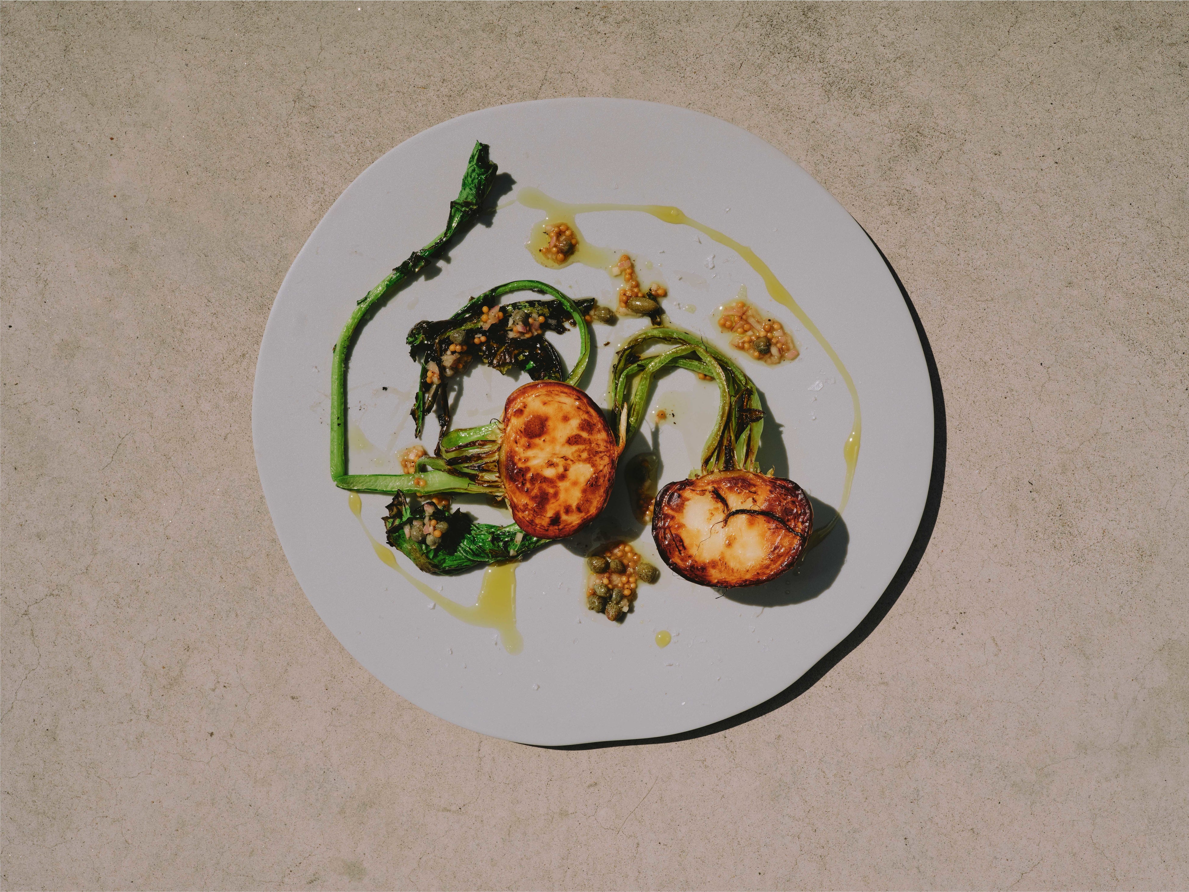 ロメインレタスの丸ごと半分を使ったシーザーサラダ。表面を強火で火入れすることで、炭火の香りと、新鮮なレタスの食感が楽しめます。