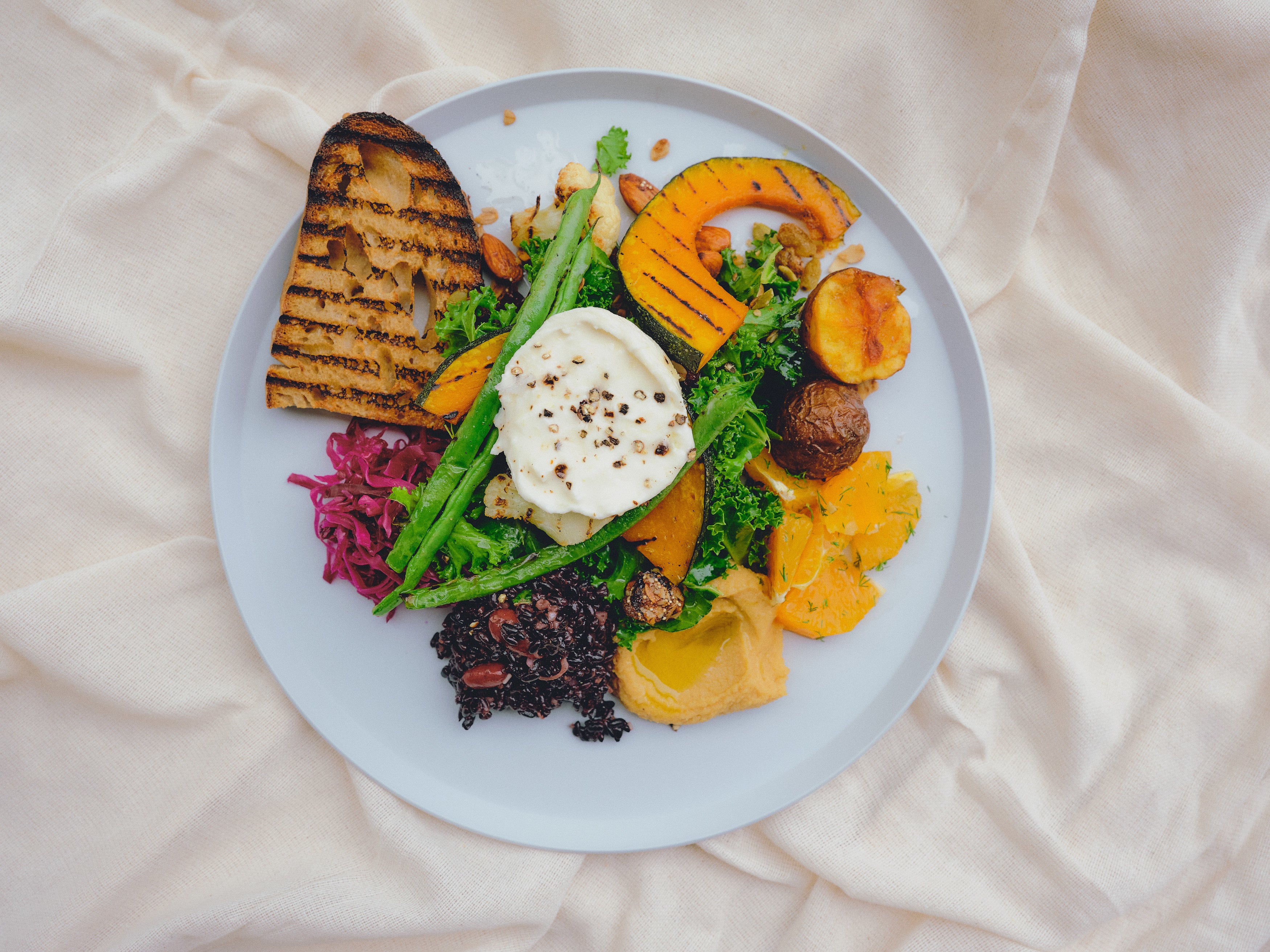 ランチのシグニチャーメニューとして楽しんでいただきたい、GARDEN HOUSEらしい野菜をふんだんに使ったプレート。栄養価の高いフムスやケールサラダなど9種の野菜のデリに、ハーフサイズのブラータチーズを豪快にのせた満足度の高い一皿です。ご希望があればチーズなしも選択可能で、ヴィーガン需要にも対応します。ベーカリー業態GARDEN HOUSE CRAFTSのカンパーニュを添えています。