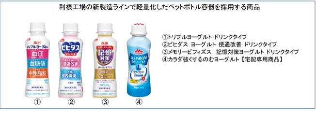 このたび、石油由来プラスチック使用量削減の取り組みとして、利根工場に新たに増設したドリンクヨーグルトの 新製造ラインにおいて、軽量化したペットボトル容器を採用します。対象商品は 4 品で、本取り組みにより、ペット ボトル容器 1 個当たりの重量が 10.0g から 8.5g となり、石油由来プラスチック使用量を 15%削減します※。 今後、利根工場の既存ドリンクヨーグルト製造ラインについても、順次、軽量化したペットボトルへ切り替えを予 定しています。