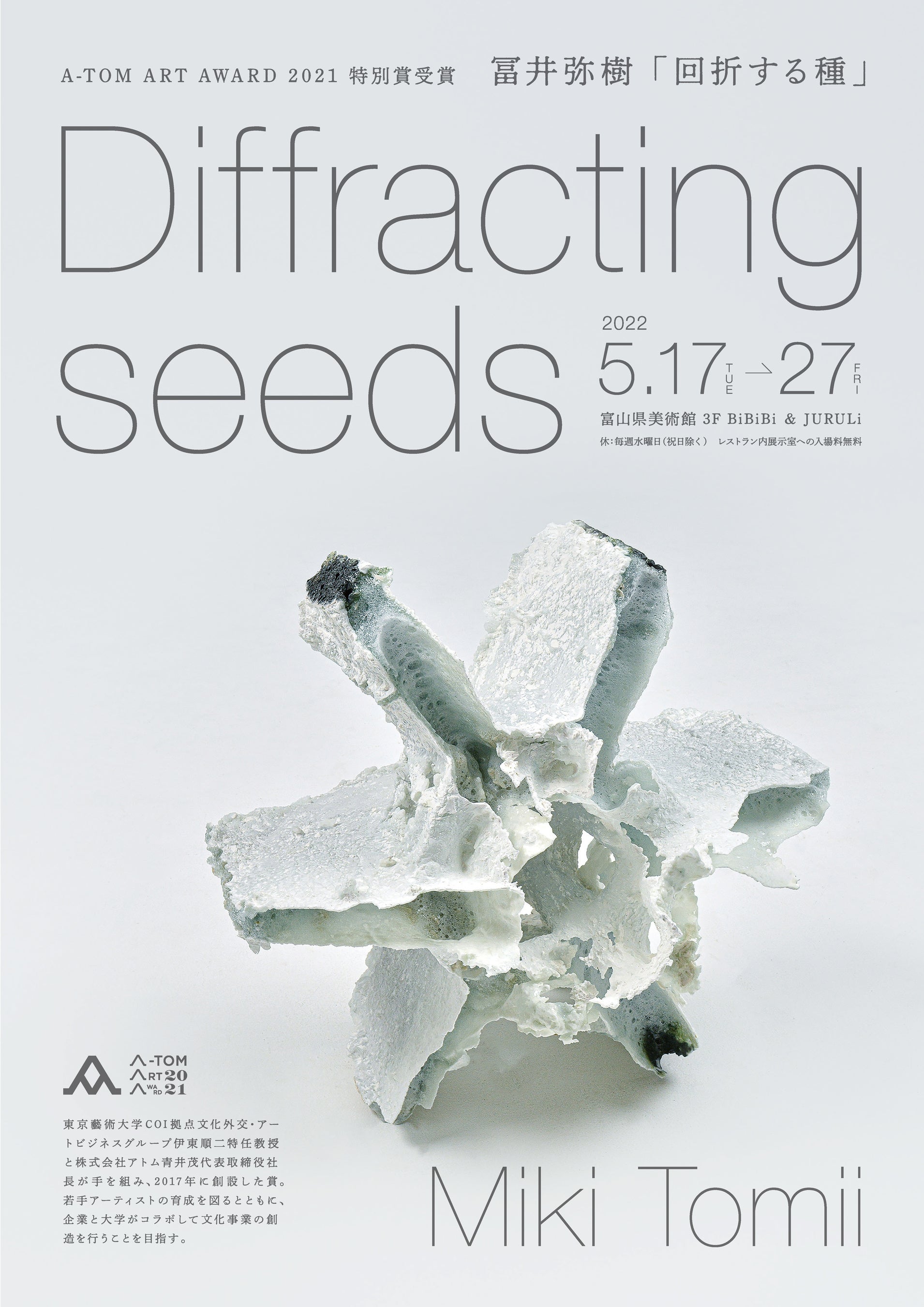 「アートとイート」をテーマとする富山県美術館内レストラン「BiBiBi&JURULi -ビビビとジュルリ-」は、関連会社・株式会社アトムが若手アーティストの支援活動として開催するA-TOM ART AWARD2021の特別賞として、アーティスト冨井弥樹の個展「回折する種」を5/17(火)~27(金)の期間中開催いたします。