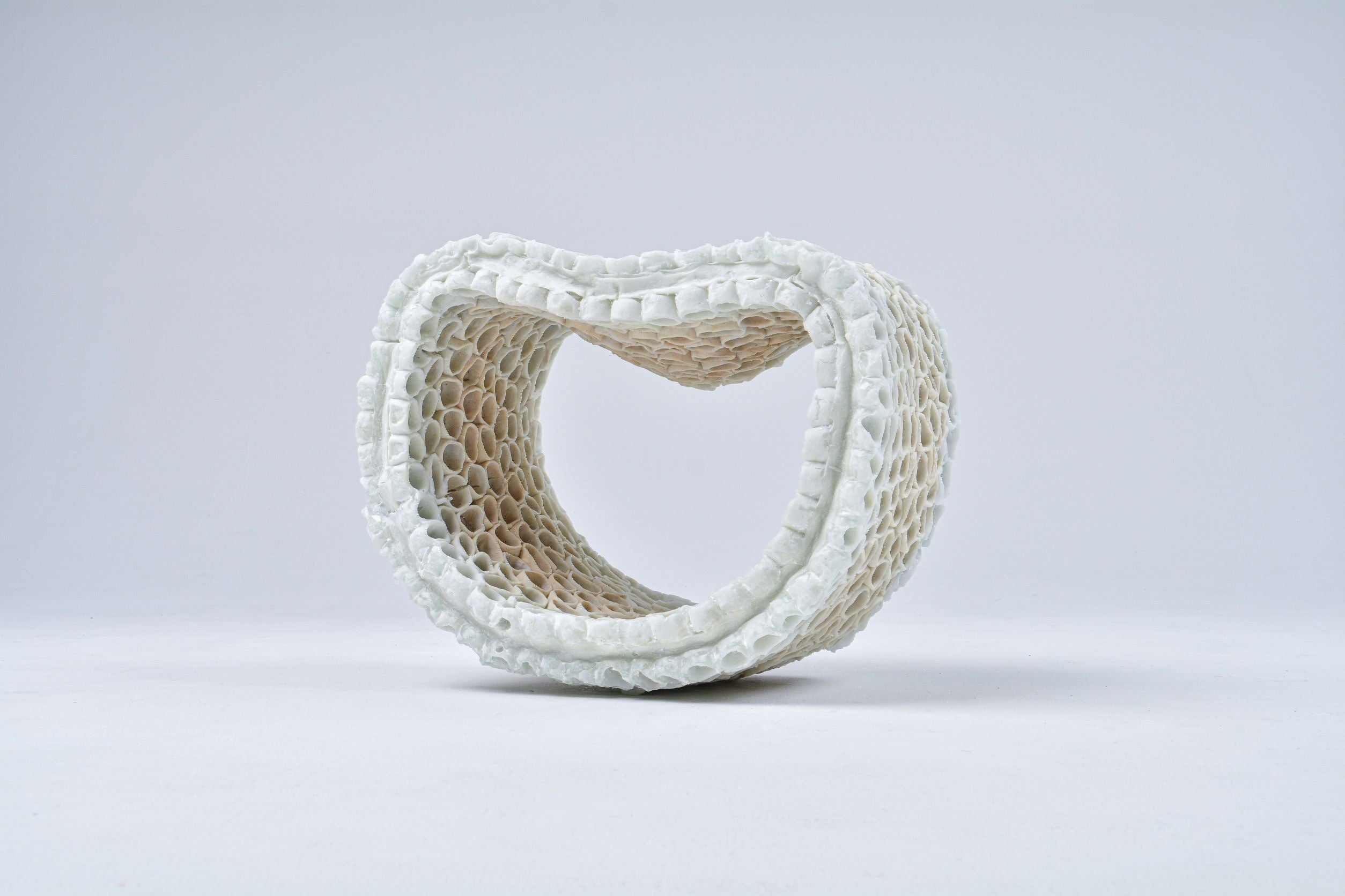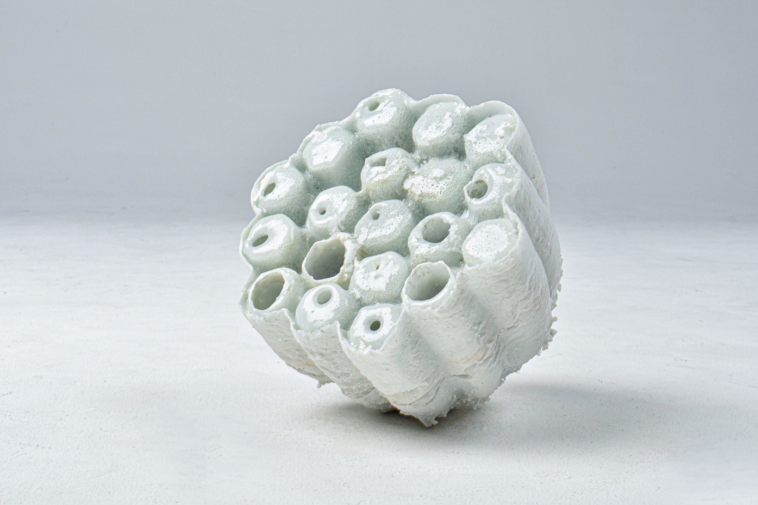 ガラスと陶土の混合実験をしていく過程で、日々素材自身のエネルギーに圧倒される。混合実験の際、窯の中でガラスと陶土という異素材同士が膨大なエネルギーと長い時間をかけながら互いが混ざり合っている。それにより素材がそれぞれ持つ強さが引き出され、ガラスと陶土がお互いを侵食し合っているように見える。そこにそれぞれの素材の意思が在るように見えた。