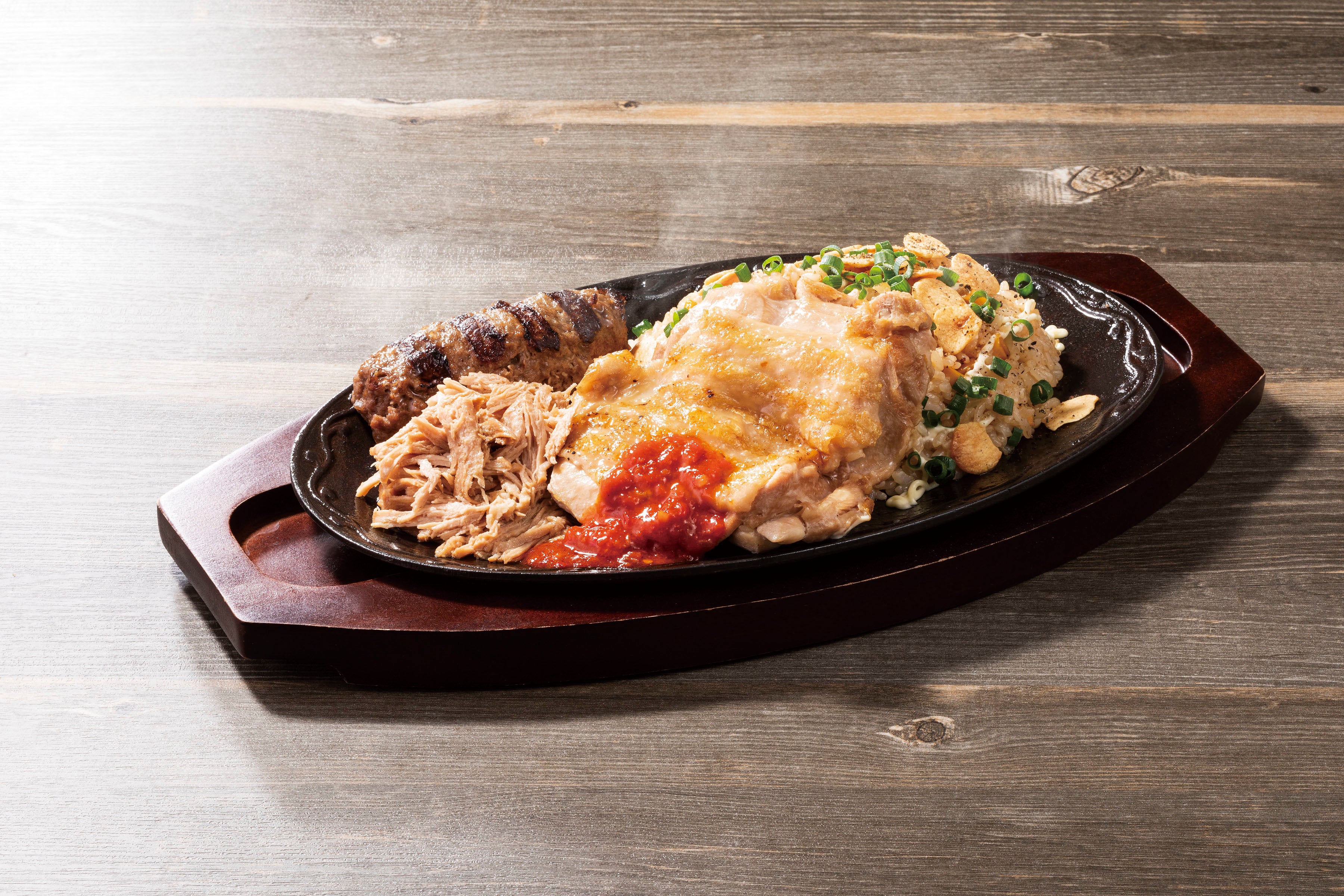 熱々の鉄板に、ビーフ、ポーク、チキンを盛り合わせた、ボリューム満点のMEATプレート!香ばしいガーリックライスは、直火釜で炒めたにんにくの風味が食欲をそそる味わい。ガツンとパンチのきいた肉とライスをワイルドに味わうのが最高です!