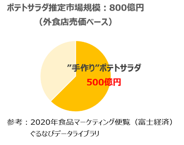 また、外食におけるポテトサラダは、推定市場規模が約800億円にのぼる人気メニューですが、そのうち約60%が手作りで提供されています。(外食店売価ベース、2020年食品マーケティング便覧、ぐるなびデータライブラリをもとに当社にて試算)