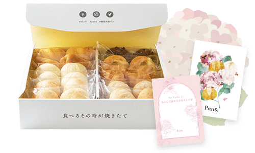 今年の「母の日ギフト」は『Pan& Thanks Delivery “母の日にパンを贈ろう” 10分間で焼きあがるパンと10分間で伝える母へのストーリー。』をテーマに、『母と子』の想いをつなぐ「特別な同梱物」を贈るプロジェクトを実施。「母の日ギフト」に、人気作家が特別に書き下ろした、10分間で読めるショートショートと母と贈り主が思いを通わす返信状をセットにした2種類のセットを用意しました。