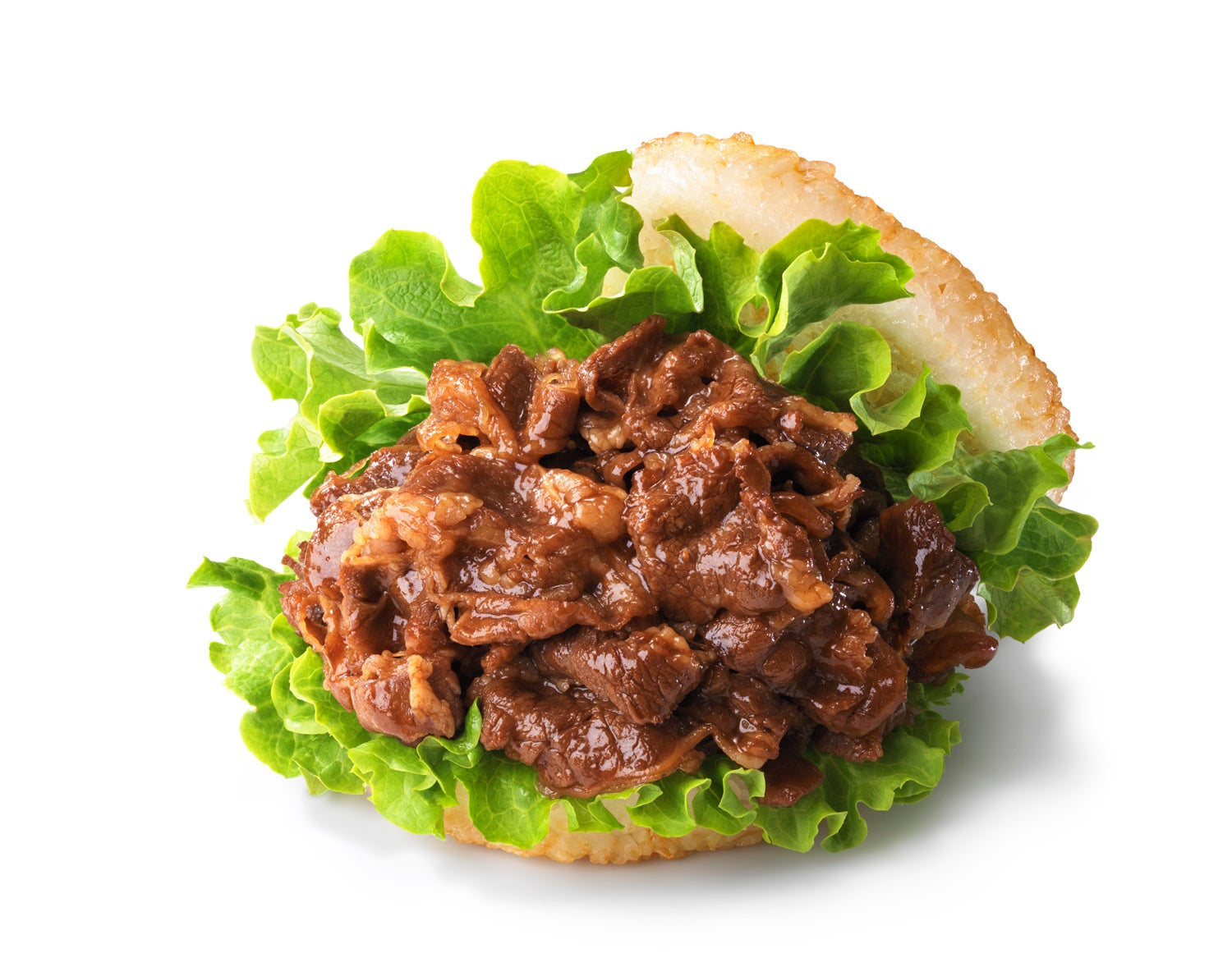 モスオリジナルの焼肉だれに漬け込んだ、甘みと旨みがあるやわらかい肉質の牛バラ肉を、グリーンリーフ、ライスプレートではさみました。通常の「モスライスバーガー焼肉」の2倍の量の焼肉を使用した、夜ごはんにふさわしいボリュームのある商品です。