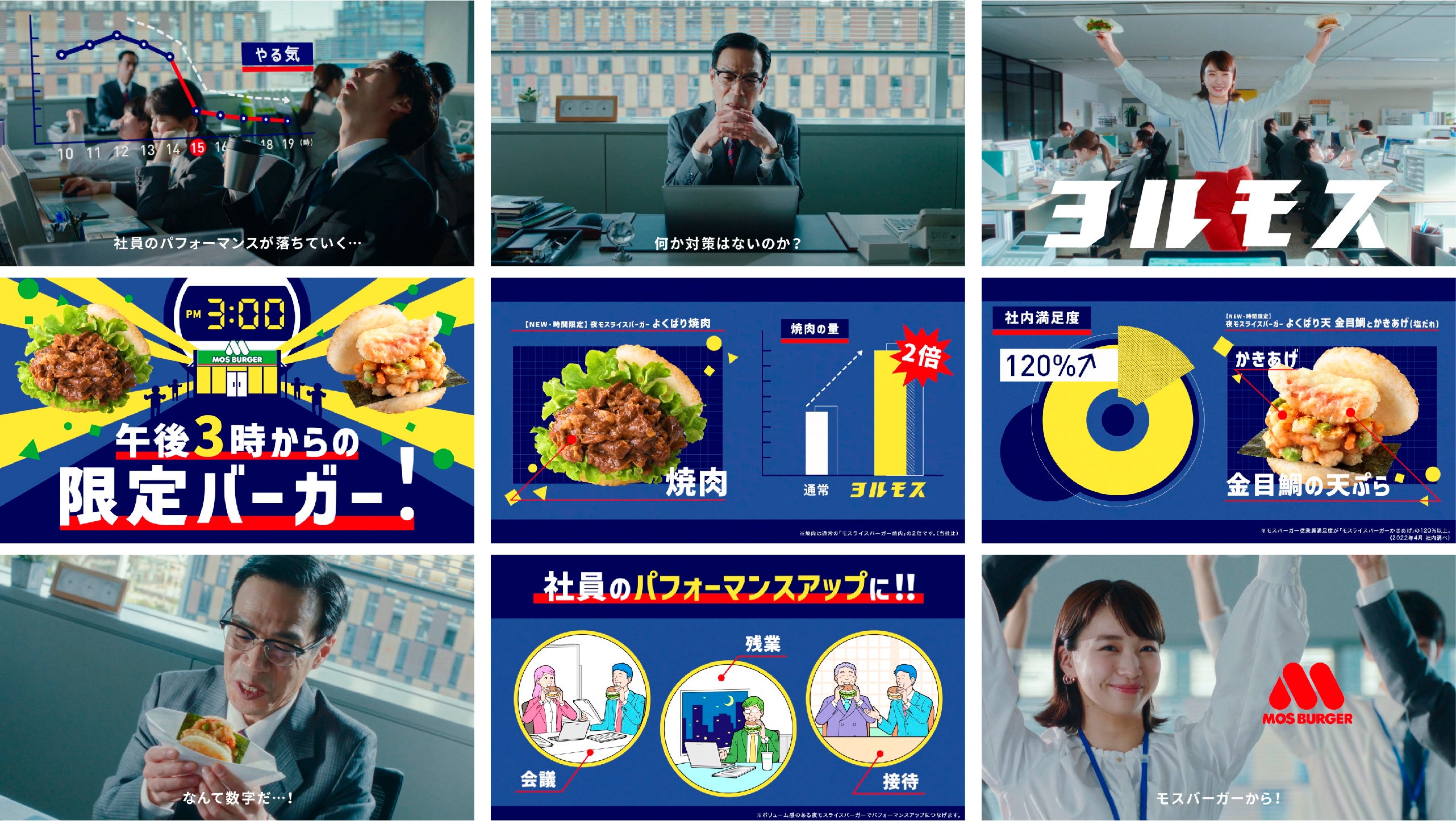 深刻な“15時以降の社員のパフォーマンス低下” 。何か対策はないものか、と悩む上司のもとへ、特徴的なポーズとともにハンバーガーを両手に持った若手社員が「ヨルモス!」の掛け声とともに登場する。若手社員はモスバーガーが提供する15時以降の夜限定メニュー「夜モスライスバーガー よくばり天 金目鯛とかきあげ(塩だれ)」と「夜モスライスバーガー よくばり焼肉」のリッチさをわかりやすく図式で解説、パフォーマンスアップの解決策として導入することを提案するのだった…… 。