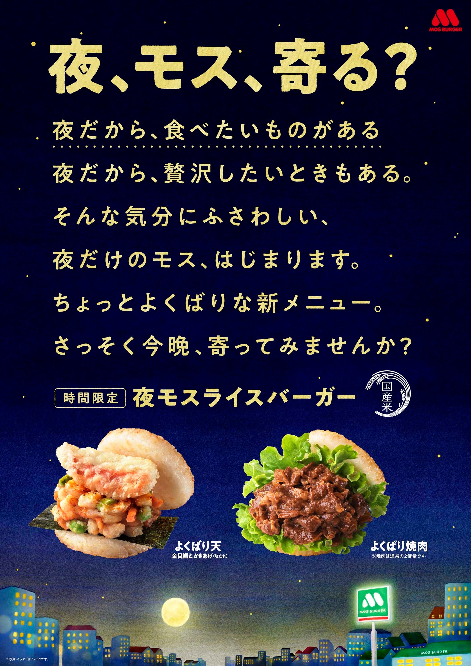 全国のモスバーガー店舗(一部店舗除く)にて、15時以降の夜限定メニューとして、夜限定のプレミアム感とボリューム感が感じられる2商品「夜モスライスバーガー よくばり天 金目鯛とかきあげ(塩だれ)」と「夜モスライスバーガー よくばり焼肉」を新発売するものです。