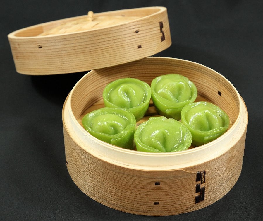 ほうれん草を練り込んだ、翡翠色のもちもち皮が特長です。温めても変わらないきれいな翡翠色が目で見て楽しい、特製の点心です。ぷりぷり食感の海老と旨味あふれるホタテを包んだ贅沢な一品は、1粒35gと食べ応えも十分です。