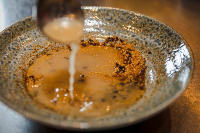 汁あり担々宮古そばに使用するスープは、めんば〜るのスープ職人が心をこめて炊き上げたもの。味のしつこさや、くどさなどは一切排除し、濃厚だけどスッキリしたおいしさに仕上がっています。沖縄県産の豚骨と鶏ガラをコトコト煮込むこと5〜6時間。丁寧にアクを取り除いたスープは、白濁しているもののとても澄んでいて、通常のスープのように背脂が浮くことなく、すべてがきれいに乳化されています。