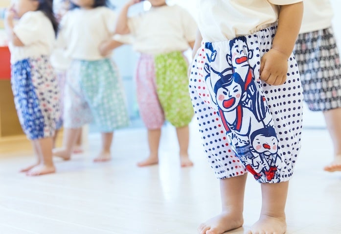 博多のお祭りの手ぬぐいで仕立てた「ぐいパン」。肌ざわりが良く、乾きやすいためお子様のアクティブウェアにぴったり。大人用もあるので、親子コーデも楽しめます。 ※写真の柄は一例