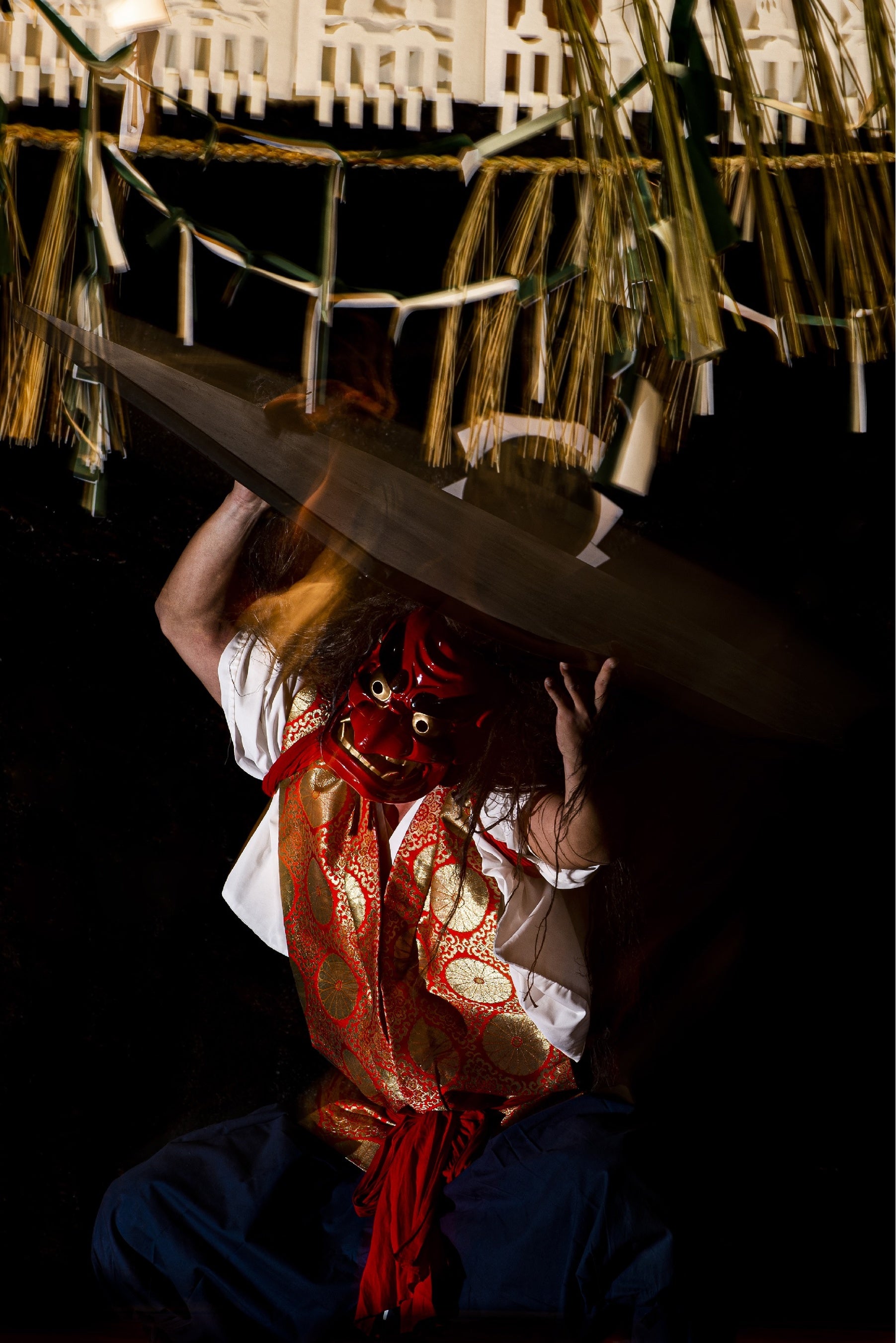 夜神楽(よかぐら)とは、宮崎県高千穂地方に伝わる、里ごとに氏神を神楽宿と呼ばれる民家などにお招きし、夜を徹して三十三番の神楽を一晩かけて奉納する、昔からの神事です。今回、その三十三ある神楽の一部を会場内特設ステージで披露いたします。