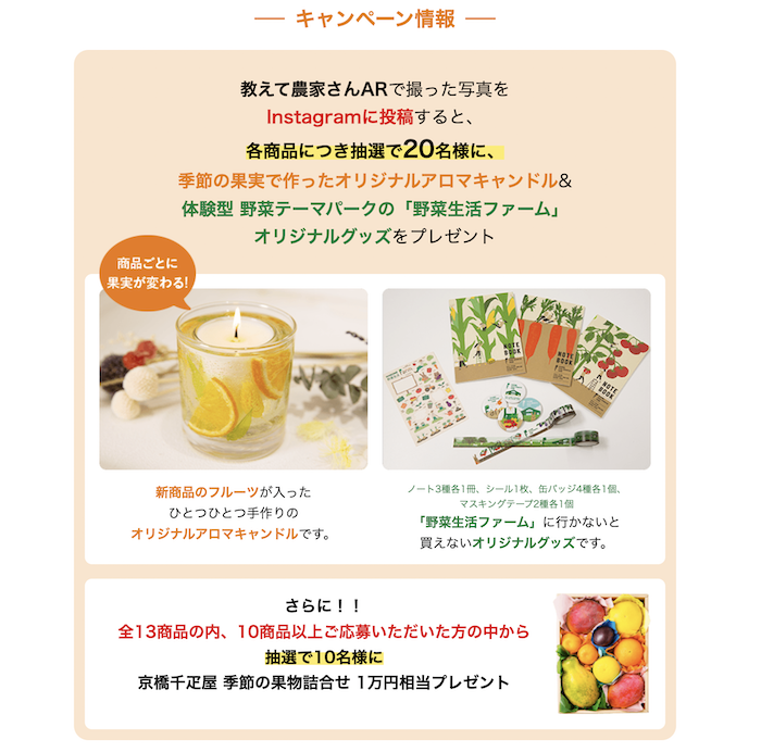 キャンペーンに応募すると、各商品につき20名様に季節の果実で作ったオリジナルアロマキャンドル&体験型テーマパークの「野菜生活ファーム」オリジナルグッズをプレゼント!